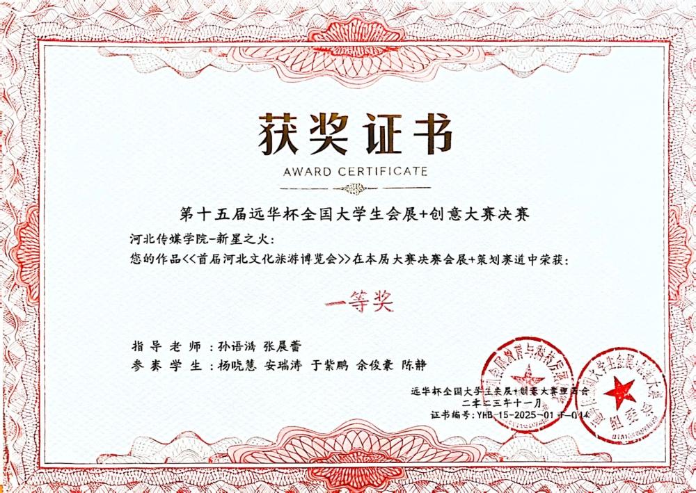 11月7日至9日,第十五届“远华杯”全国大学生会展+创意大赛决赛在广州清远成功举办。作为全国会展专业领域极具影响力的赛事,本届大赛吸引了来自全国87所高校的464支队伍同台竞技,并最终筛选出113支队伍晋级决赛。我校学生凭借出色的综合表现在决赛中斩获多项荣誉:河北传媒学院获教学成果一等奖,“新星之火队”《首届河北文化旅游博览会》、“星河队”《第二十三届中国玩具展》摘得一等奖,其余队伍斩获二等奖5项。